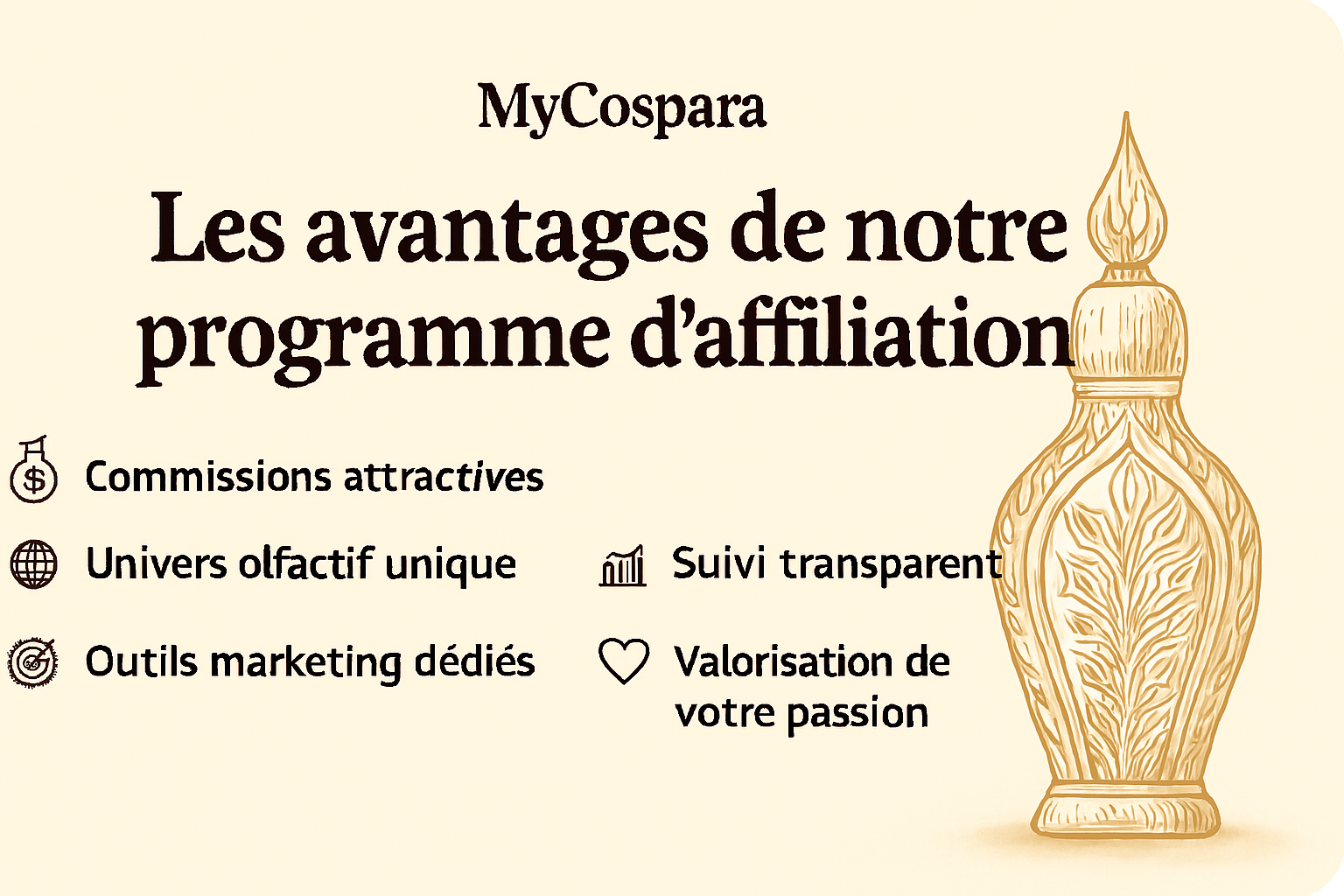 Rejoignez notre univers olfactif et devenez ambassadeur de la parfumerie arabe. Grâce à notre programme d’affiliation, vous pouvez partager vos coups de cœur, inspirer votre communauté et générer des commissions sur chaque vente réalisée via votre lien personnalisé. Simple, transparent et enrichissant — votre passion devient une source de revenus